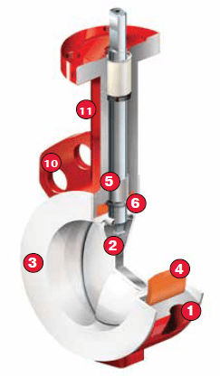 ❸ Эластичное седло специальной формы обеспечивает полную изоляцию корпуса от воздействия рабочей среды. Кривизна внутренней поверхности седла уменьшает трение между диском и седлом при повороте диска, снижает вращающий момент и минимизирует истирание седла и футеровки диска. Широкие внешние кромки седла служат уплотнением фланцевого соединения, что позволяет обходиться без применения фланцевых уплотнительных прокладок.