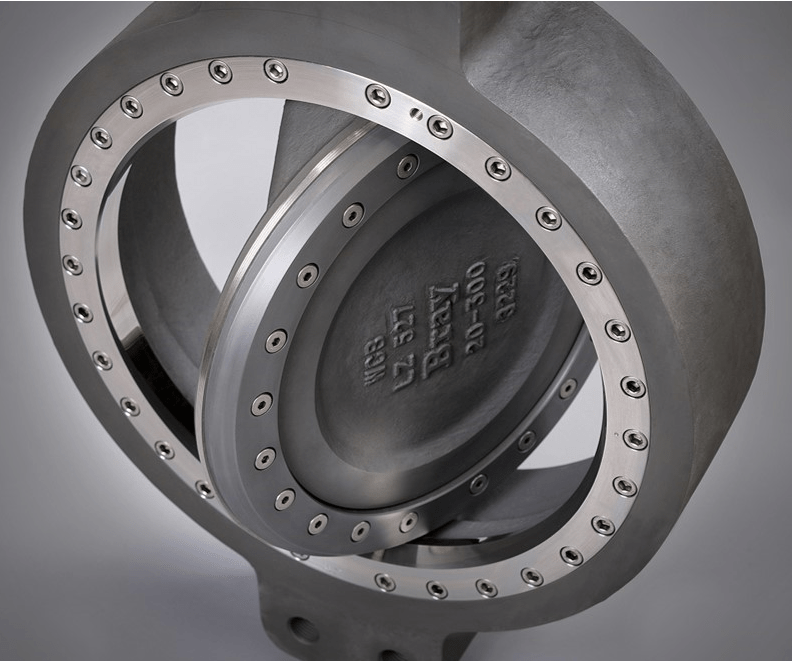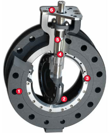 ❸ Уплотнение корпуса выполнено в виде кольца, которое располагается в пазу корпуса и фиксируется прижимными болтами. Отверстия под болты расположены таким образом, чтобы уплотнительное кольцо при монтаже затвора в трубопроводе полностью изолировало болты от воздействия рабочей и окружающей среды. Уплотнительное кольцо имеет профиль специальной формы, которая и образует третий эксцентриситет. Такая конструкция исключает смещение или проворачивание седла, тем самым устраняется трение между седлом и уплотнительным кольцом. После того, как седло и уплотнительное кольцо соприкасаются, привод создает прижимной момент, который прижимает уплотнительное кольцо к седлу без трения и обеспечивает абсолютную двухстороннюю герметичность с уплотнением металл-металл. По этой причине трехэксцентриковые затворы часто называют «моментной арматурой», так как важно правильно выставить момент, а не «положение», как в случае двухэксценриковых затворов. В процессе работы если седло повредилось или износилось, его можно легко заменить даже в полевых условиях, для этого не требуется специальное оборудование или оснастка.