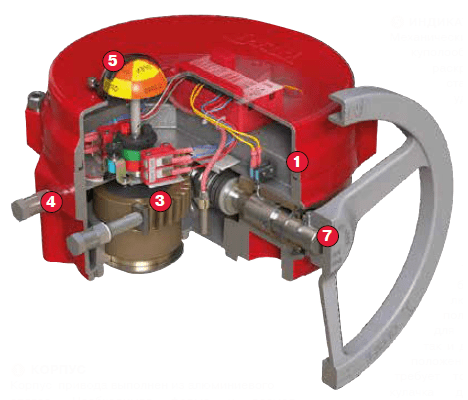 ❸ Функция самоблокировки червячной передачи и редуктора, которая удерживает арматуру в нужном положении без использования электромеханической тормозной системы.