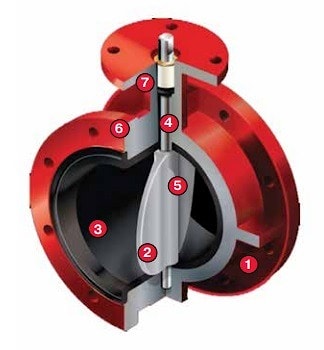 ❸ Эластичное седло специальной формы устанавливается в корпус затвора по принципу "шип-паз", обеспечивая тем самым полную изоляцию корпуса от воздействия рабочей среды. Кольцевой буртик на внешней кромке эластичного седла служит уплотнением фланцевого соединения, что позволяет обходиться
